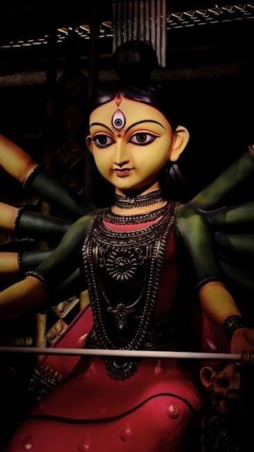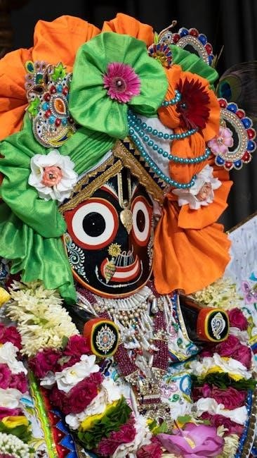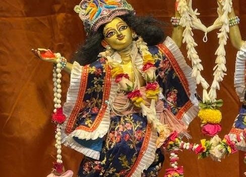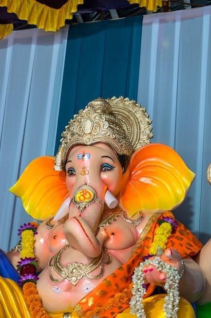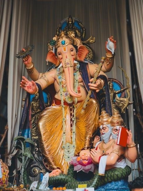 Lord Satyanarayan is revered as an incarnation of Lord Vishnu, embodying truth and righteousness. This avatar is often depicted holding a sacred vessel, symbolizing divine grace. The pooja is performed to seek his blessings for prosperity, peace, and spiritual growth. Mythological tales describe Lord Satyanarayan as a protector of dharma, ensuring cosmic balance. Devotees believe worshiping him fosters moral integrity and divine connection. The rituals and hymns in the Satyanarayan Pooja PDF guide reflect his divine attributes, making the ceremony a profound way to honor Vishnu’s benevolent form.